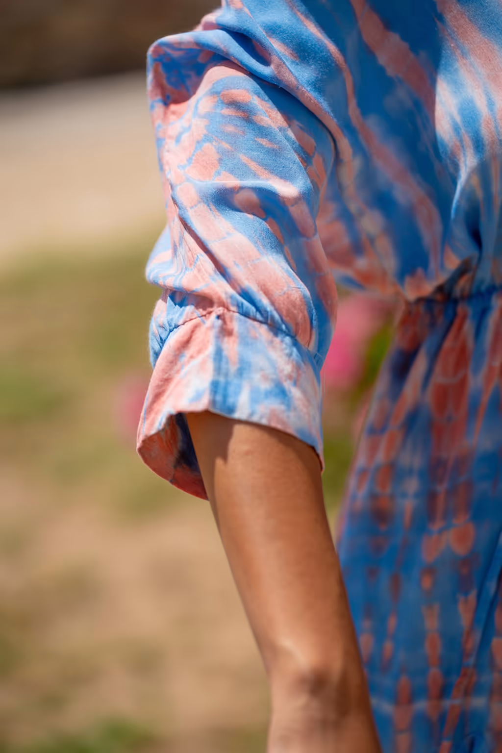 Η λαιμόκοψη V και το μανίκια τριών τετάρτων ολοκληρώνουν το σχέδιο, προσφέροντας την τέλεια ισορροπία μεταξύ κάλυψης και δροσιάς. Είναι το ιδανικό ρούχο για τις βόλτες στο ηλιοβασίλεμα ή για ένα χαλαρό γεύμα δίπλα στη θάλασσα.