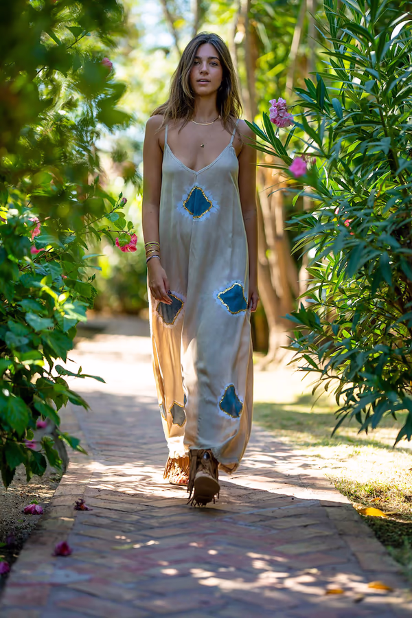Fall in love with long boho dress Lanzarote. The perfect combination of elegance and comfort handmade in Bali. This rayon dress with adjustable straps is a must-have, feel unique!