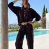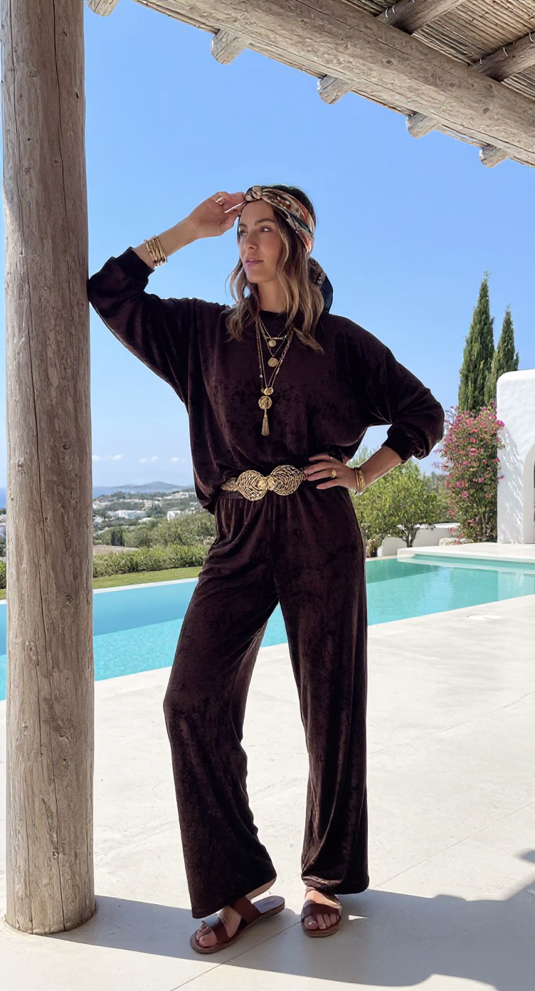 Nuestro chándal de terciopelo es la definición del lujo confortable. Este precioso conjunto de pantalón y sudadera a juego es ideal para estar cómoda sin renunciar al estilo. El tejido de terciopelo es increíblemente suave al tacto y tiene un brillo sutil que eleva la prenda, convirtiéndola en la opción perfecta para tus momentos de relax, para viajar o incluso para un look casual de calle. El pantalón cuenta con una cómoda cintura elástica y prácticos bolsillos, mientras que la sudadera tiene un corte relajado y favorecedor.
