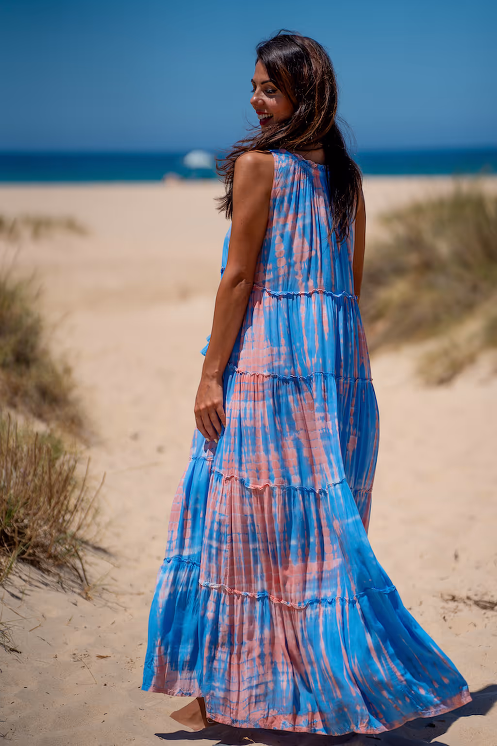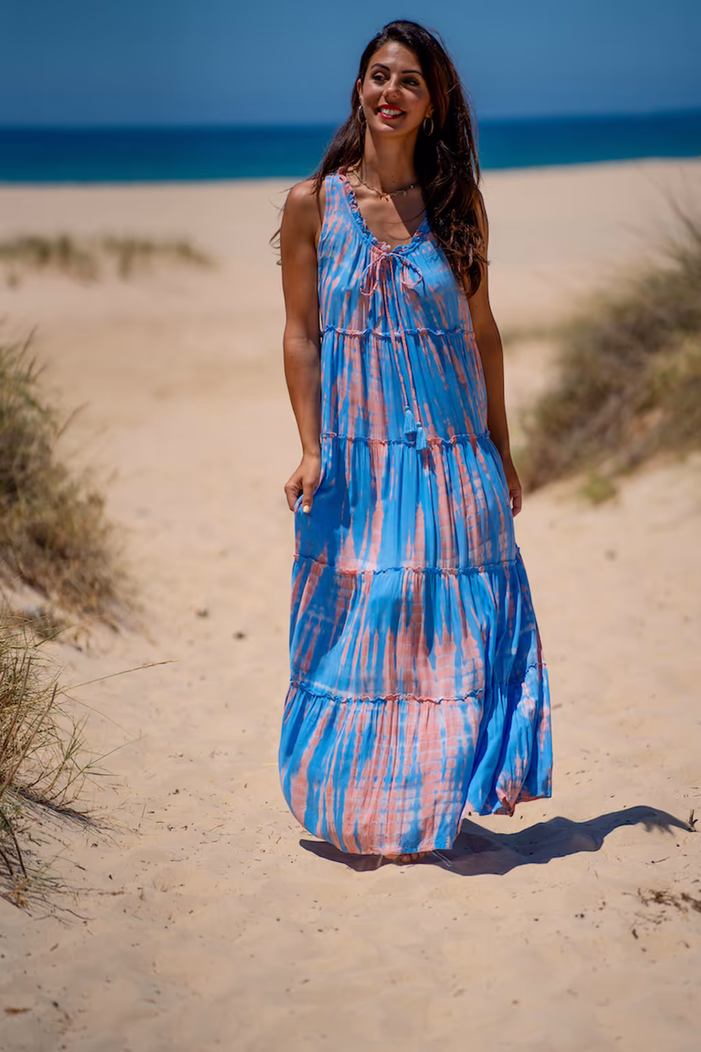 Lo que hace resaltar a este maxi vestido fluido es su origen y confección. Ha sido diseñado de forma totalmente artesanal en nuestros talleres en Bali, utilizando técnicas tradicionales que garantizan una prenda con alma. El estampado tie dye se realiza con pigmentos naturales, lo que asegura no solo colores orgánicos y armoniosos, sino también una exclusividad total: al ser un proceso manual, no hay dos vestidos exactamente iguales.