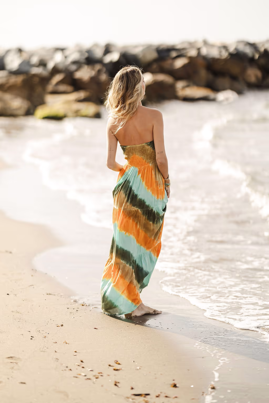 Sabemos que en verano la comodidad es tan importante como el estilo. Por ello, el vestido largo con conchas formentera incluye un elástico ancho en nido de abeja en toda la espalda. Este detalle técnico permite que la prenda se adapte perfectamente a tu contorno sin oprimir, garantizando un ajuste y confort 100% perfectos durante todo el día.