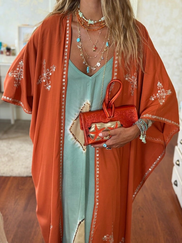 Kimono lleno de bordados y abalorios cosidos a mano en Bali. Se puede ajustar con el cinturón. Es un poco más corto por delante que por detrás. No transparenta nada.