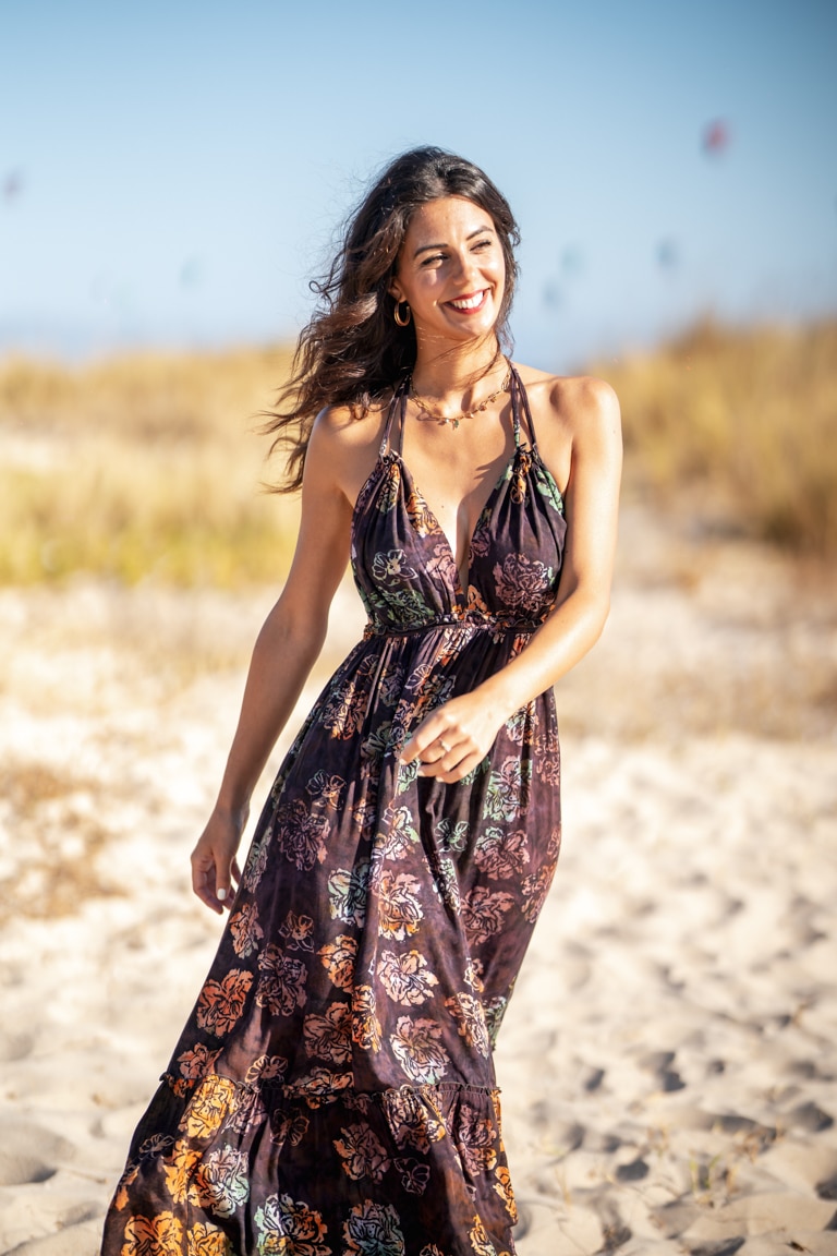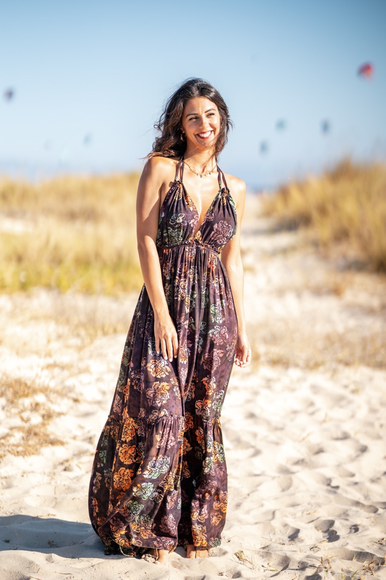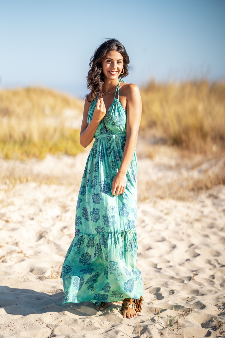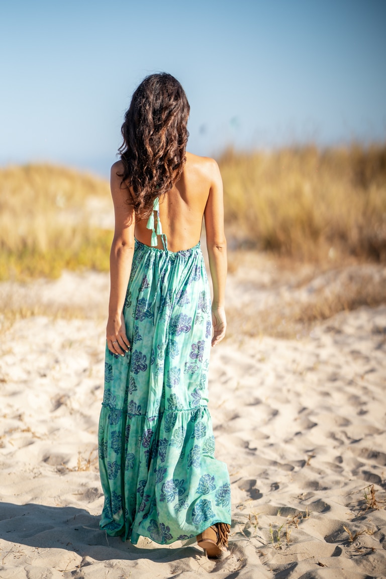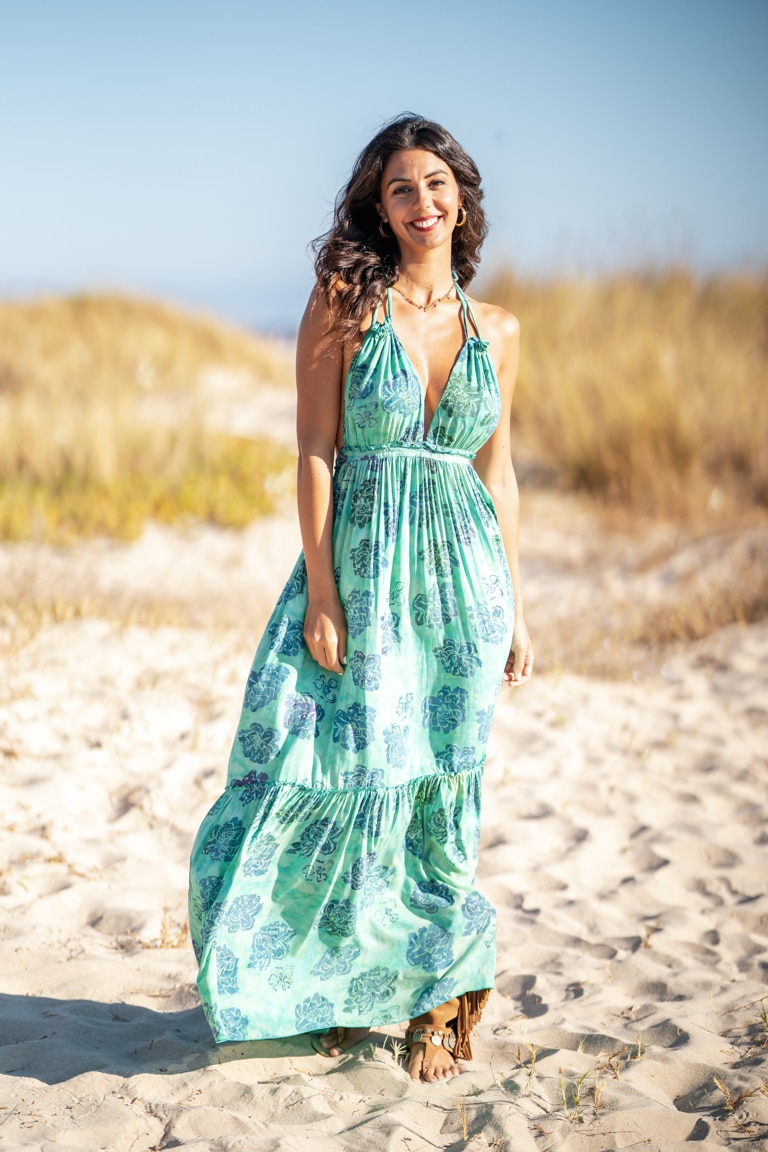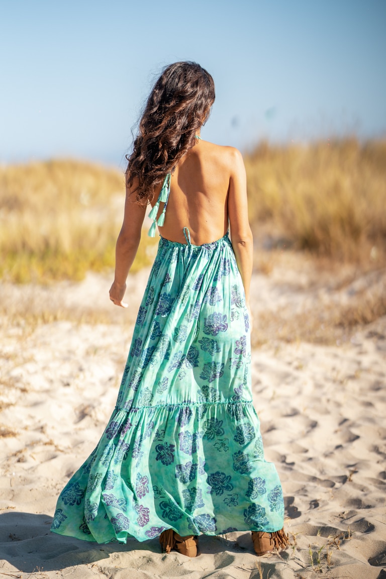 Espectacular vestido batik hecho a mano en Bali con volante y espalda abierta. Se ajusta al cuerpo mediante lazadas.