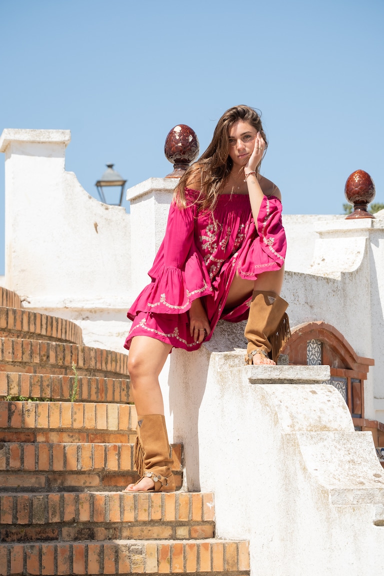 Vestido corto con bordados y volantes. Lleva elástico para ajustar en la cadera y también para que puedas llevar los hombros destapados o no, según te guste. Decorado con bordados y sutiles lentejuelas cosidas.