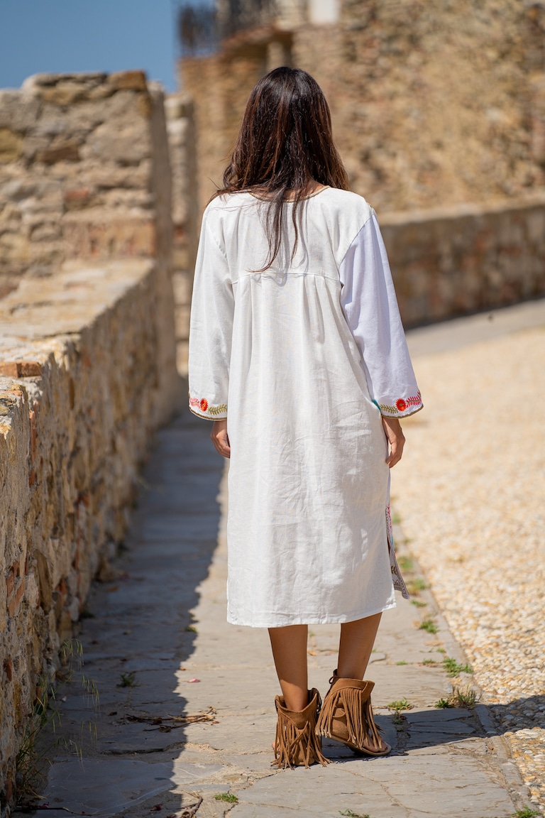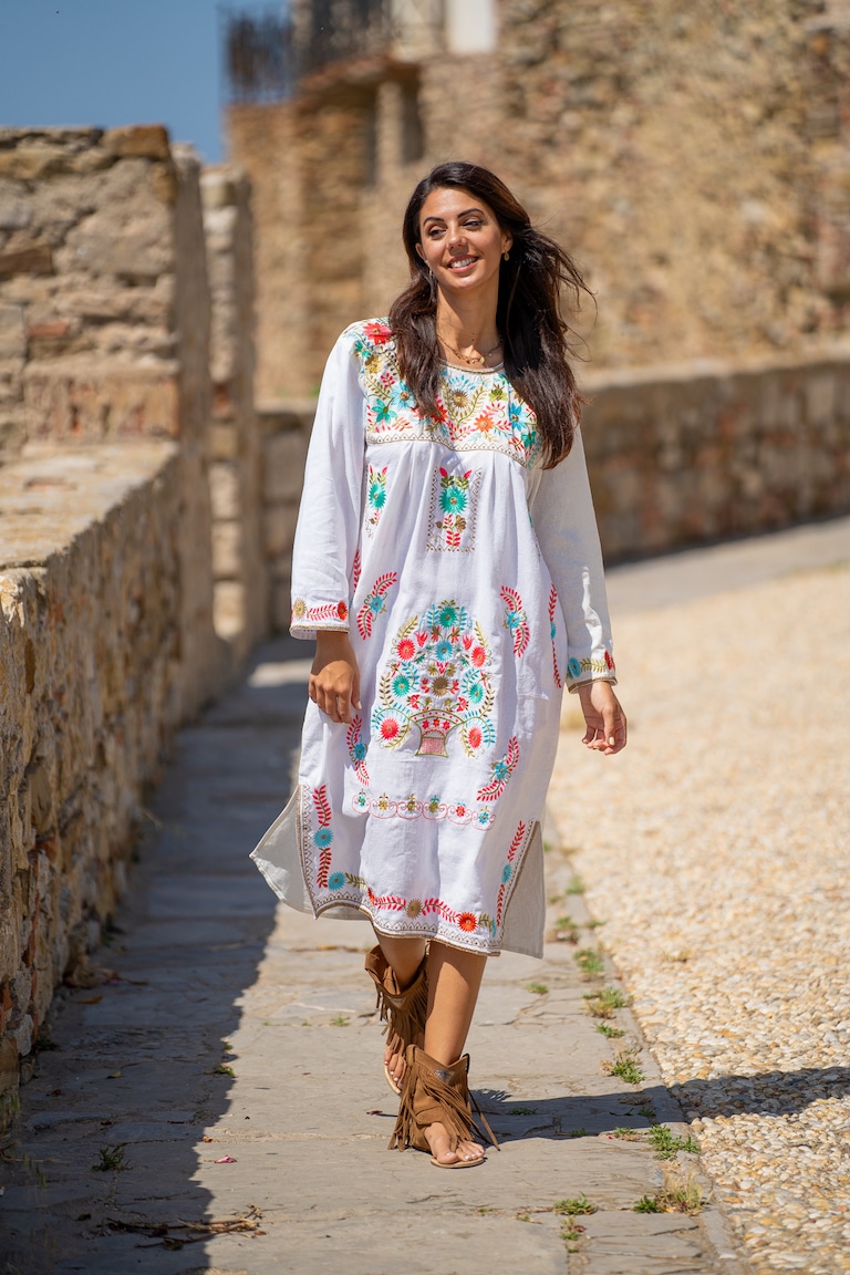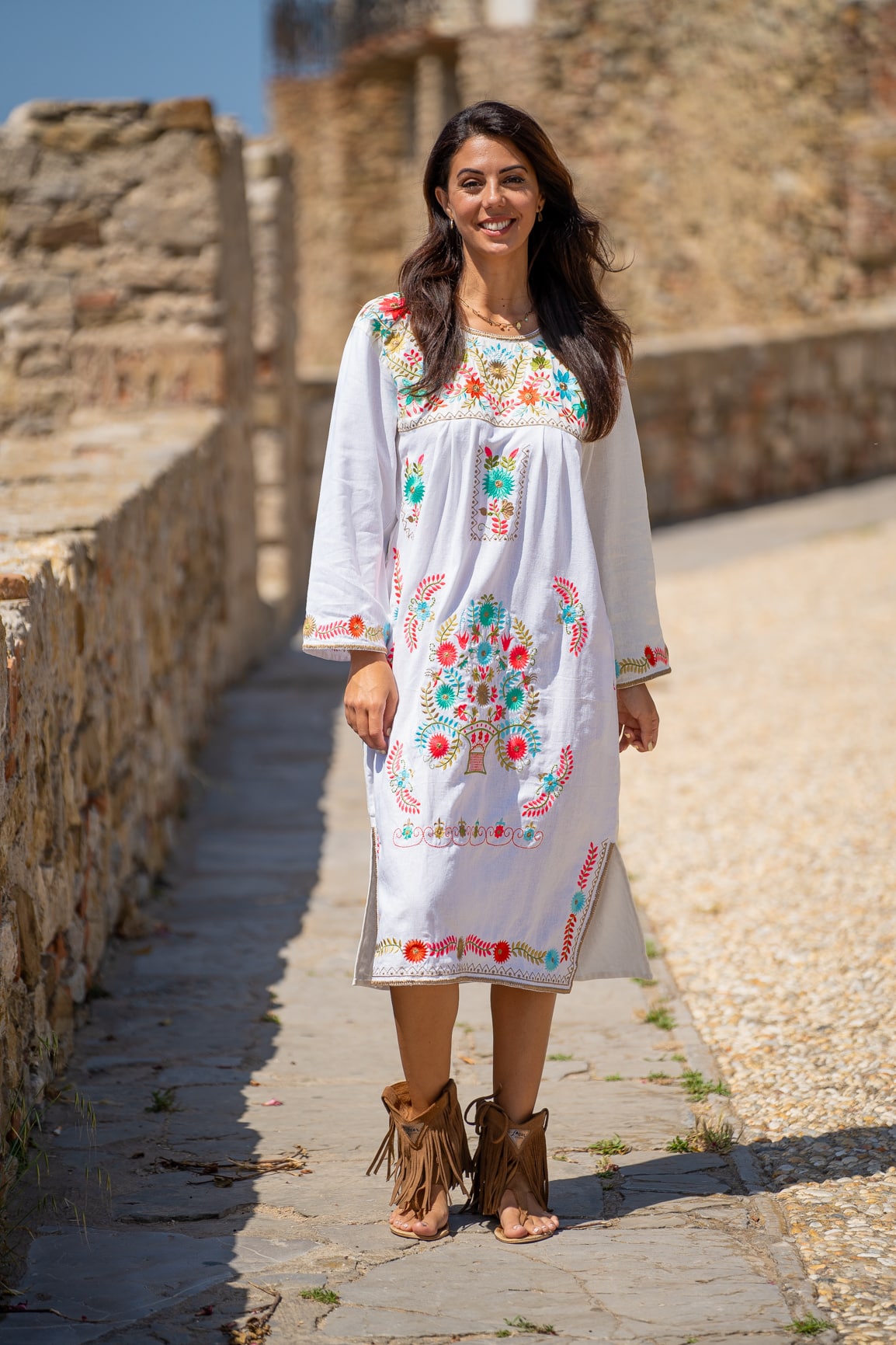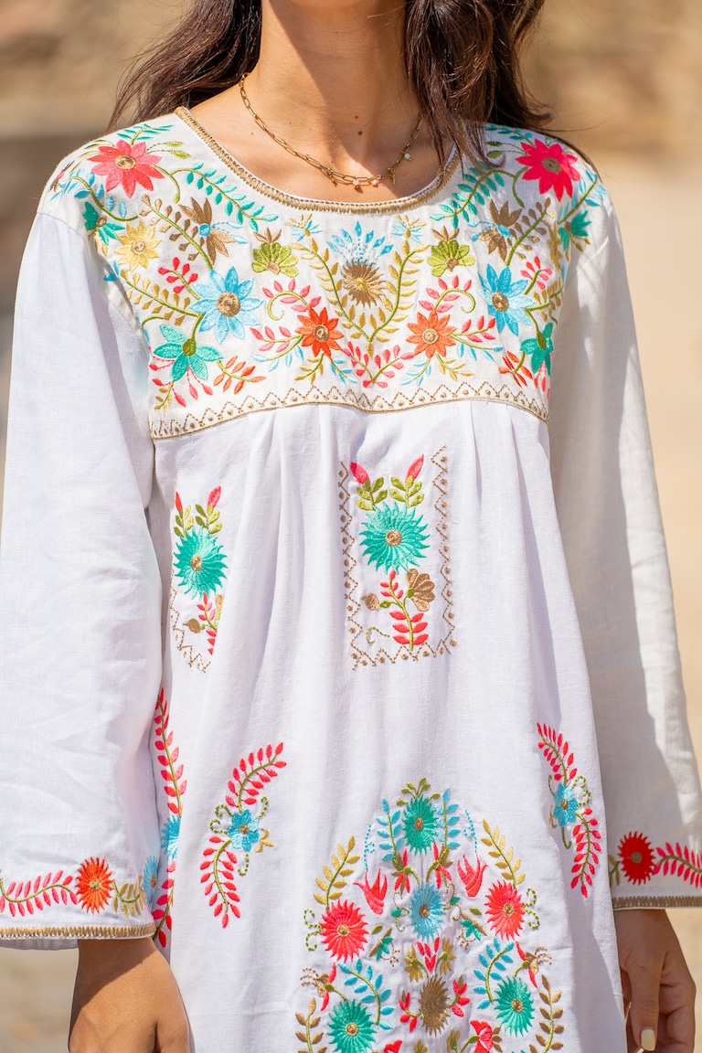Precioso vestido de estilo étnico con bordados maravillosos. La combinación de colores vivos le da un toque muy alegre y moderno. Además, la manga larga pero amplia y el cuello redondo le aportan un aire elegante y cómodo. Es súper cómodo y original y nos encanta tanto con sandalias como en los meses que vienen con botitas camperas y chaqueta.
