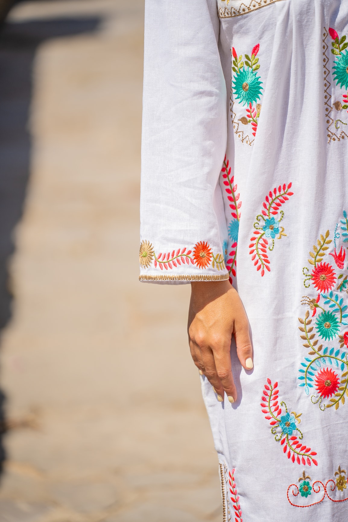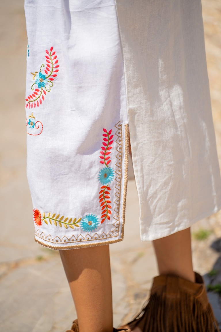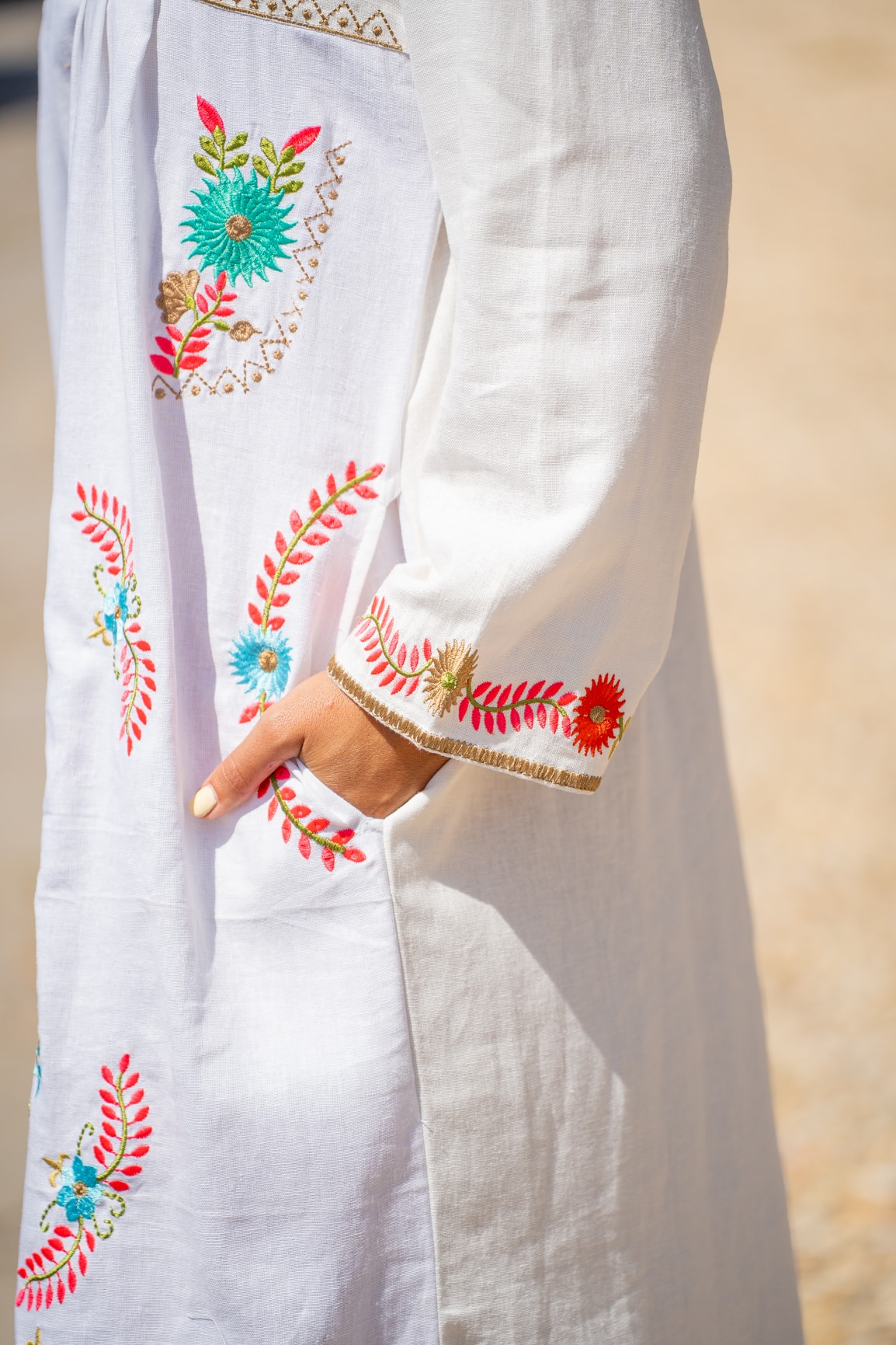 Precioso vestido de estilo étnico con bordados maravillosos. La combinación de colores vivos le da un toque muy alegre y moderno. Además, la manga larga pero amplia y el cuello redondo le aportan un aire elegante y cómodo. Es súper cómodo y original y nos encanta tanto con sandalias como en los meses que vienen con botitas camperas y chaqueta.