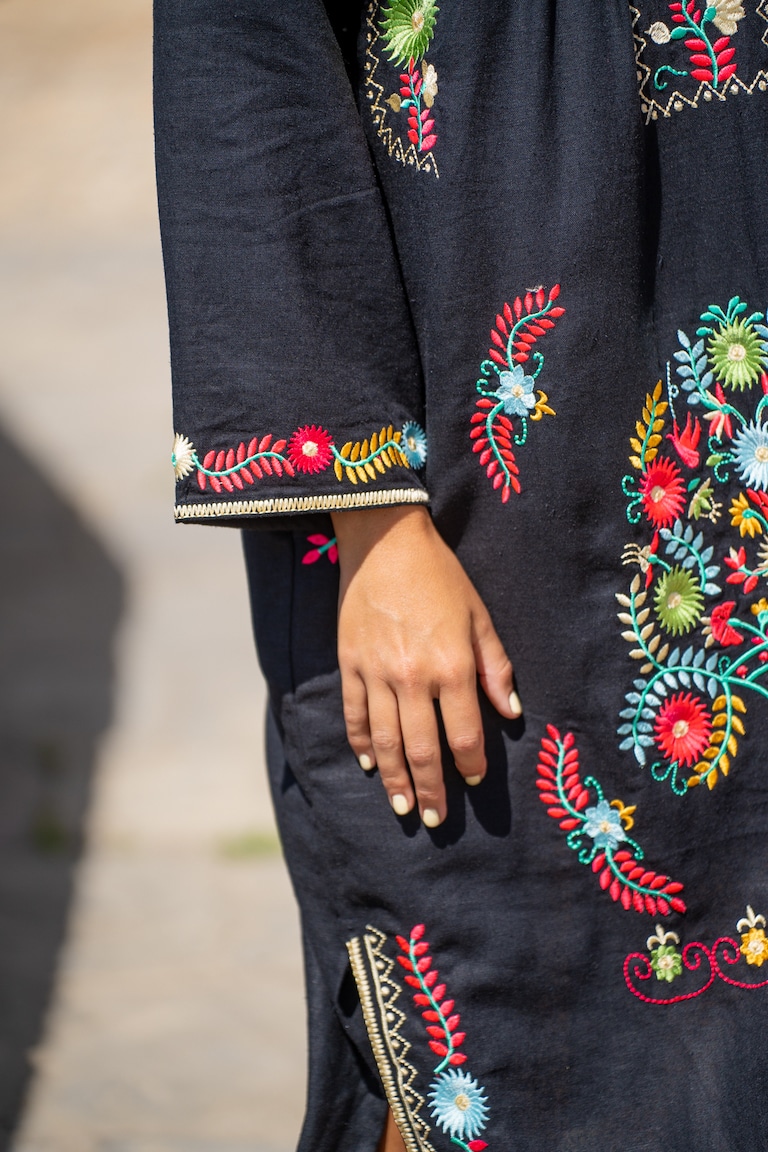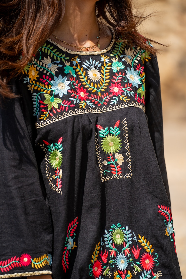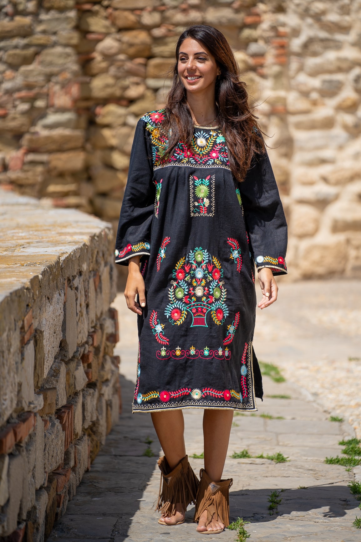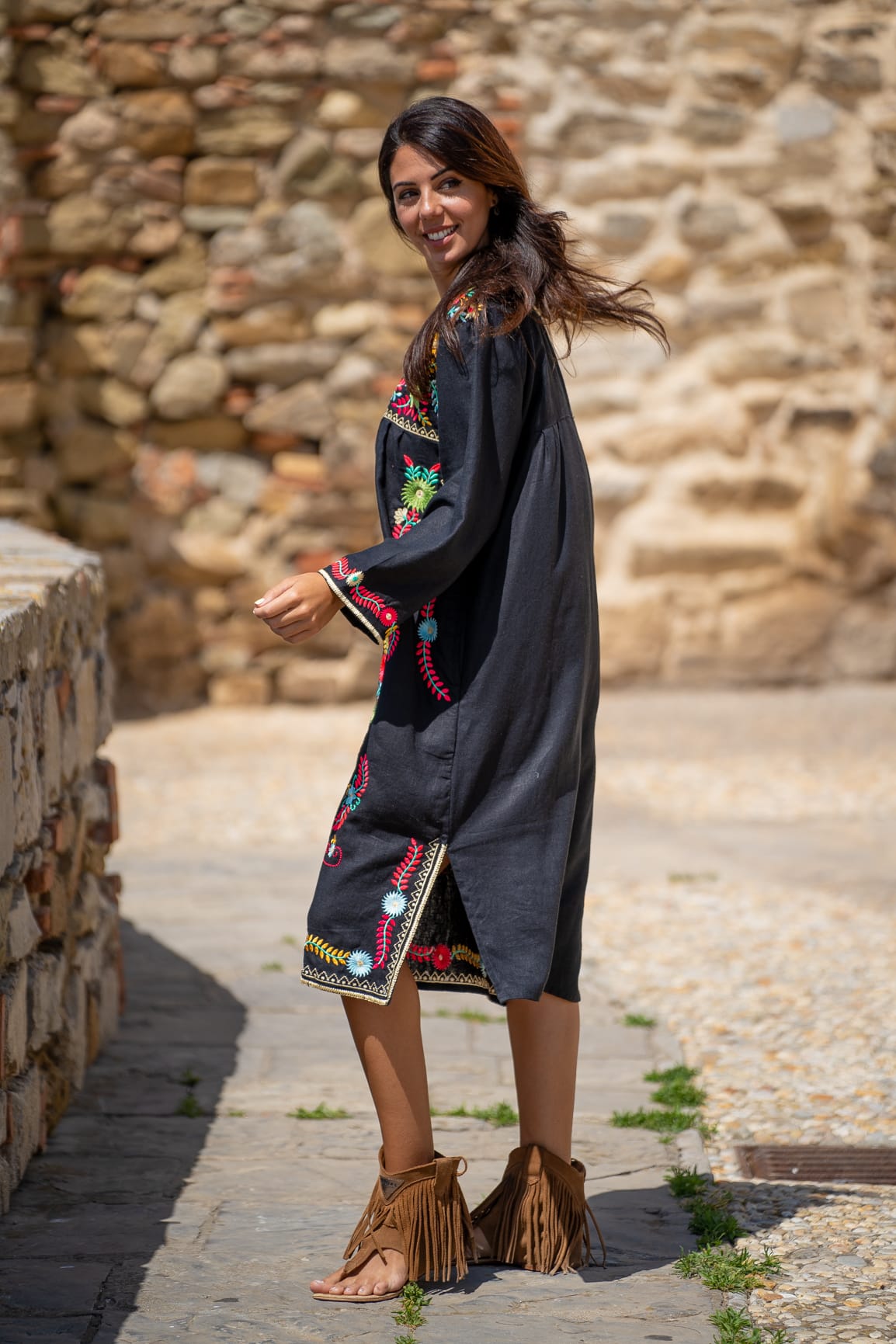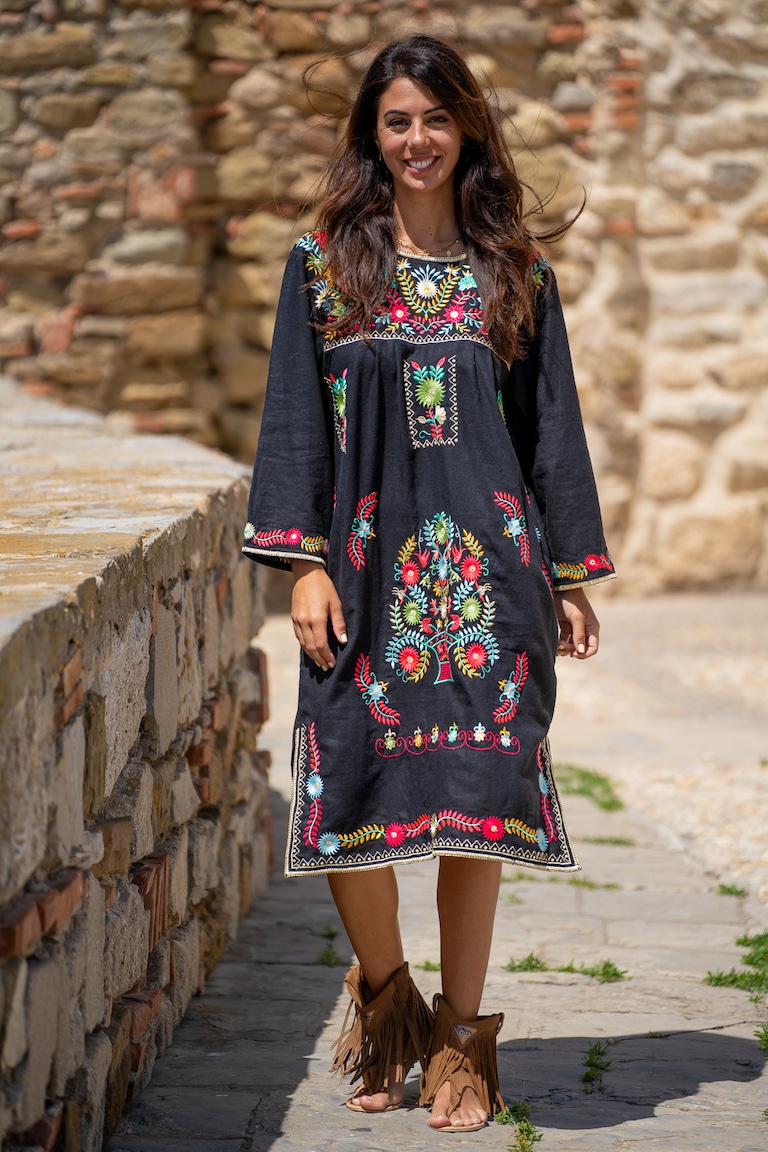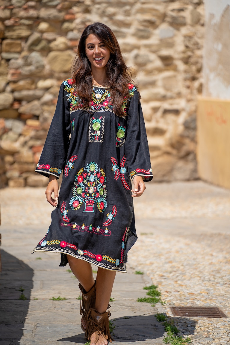Precioso vestido de estilo étnico con bordados maravillosos. La combinación de colores vivos le da un toque muy alegre y moderno. Además, la manga larga pero amplia y el cuello redondo le aportan un aire elegante y cómodo. Es súper cómodo y original y nos encanta tanto con sandalias como en los meses que vienen con botitas camperas y chaqueta.